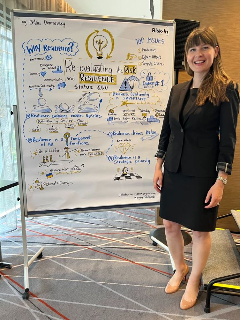 I was at Risk-In22 today in Zurich, Switzerland to present about how to reevaluate the risk and resilience status quo. They invited a Ukrainian illustrator to visualize my presentation — such a cool initiative!